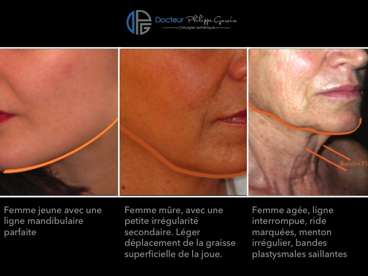 En effet, il existe un glissement vers le bas de la loge graisseuse superficielle qui se trouve bloquée entre deux points fixes que sont le ligament mandibulaire et l’artère faciale.